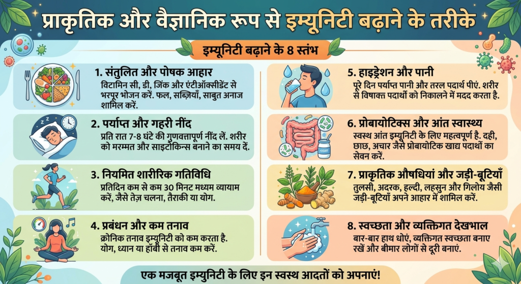 इम्युनिटी (रोग प्रतिरोधक क्षमता) बढ़ाने का विज्ञान हजारों साल पुराना है, जो प्राचीन भारतीय चिकित्सा पद्धति, ‘आयुर्वेद‘ से गहराई से जुड़ा हुआ है। आयुर्वेद में ‘ओजस‘ का सिद्धांत इम्युनिटी का आधार है। हाल के कोविद-19 महामारी ने लोगों को एक बार फिर से अपनी पारंपरिक जीवनशैली और खान-पान की ओर लौटने के लिए प्रेरित किया है। आधुनिक चिकित्सा विज्ञान भी मानता है कि एक संतुलित आहार, नियमित व्यायाम और अच्छी नींद इम्युनिटी को मजबूत बनाने में महत्वपूर्ण भूमिका निभाते हैं। यह एक सतत प्रक्रिया है, जो दीर्घकालिक स्वास्थ्य का आधार बनती है।