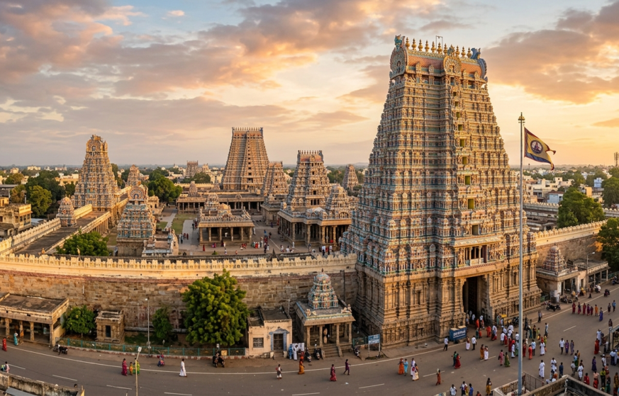 “कावेरी की गोद में बसा, कला और भक्ति का सबसे विशाल आंगन—यही है श्रीरंगम का गौरव।”